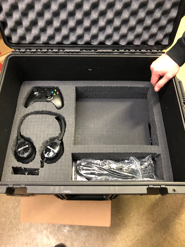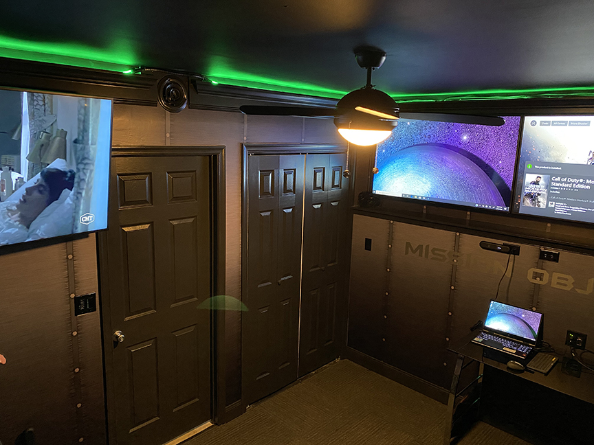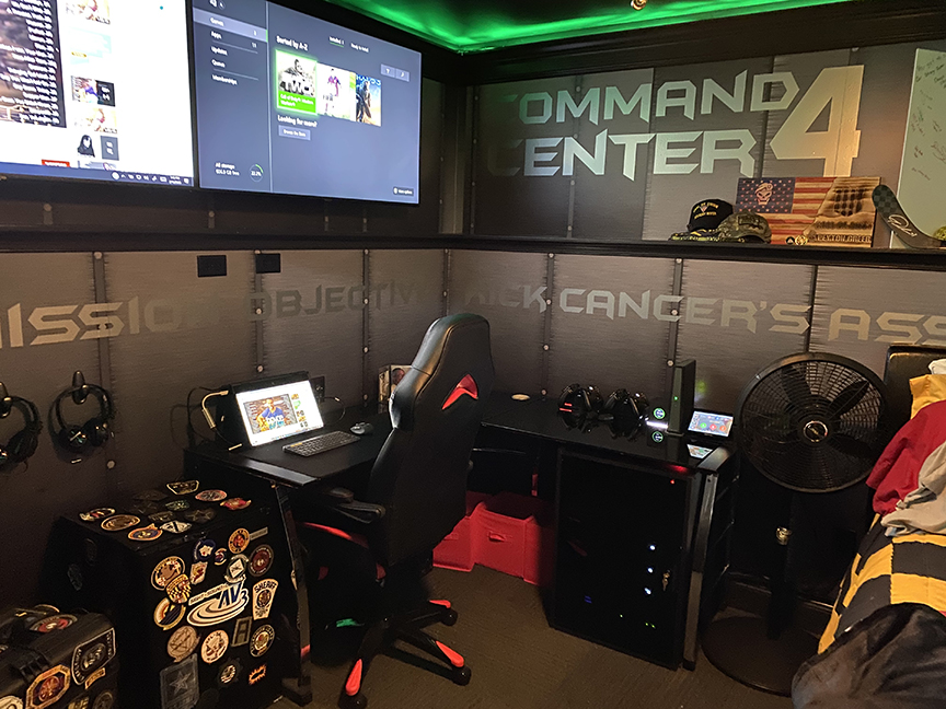 Jason, Lou, and Dieter designed a young man’s dream room – a place where Peyton could escape his worries and just be 14 years old. In just two short weeks, they designed a Central Command room comprised of THREE 55” TVs, a Crestron Touch Panel, THREE dedicated Xbox stations with headsets and games, and of course, a refrigerator stocked with chocolate milk! A personalized pelican case adorned with local and state police, military commands, and PMA patches full of separate Xbox gear was also gifted to Peyton to occupy his time while receiving treatments in the hospital. Additionally, because siblings are often overlooked during such a difficult time, each sibling was gifted a basket full of goodies!