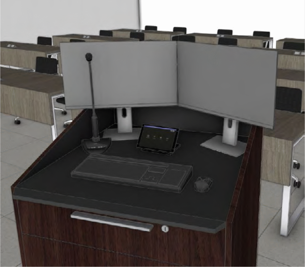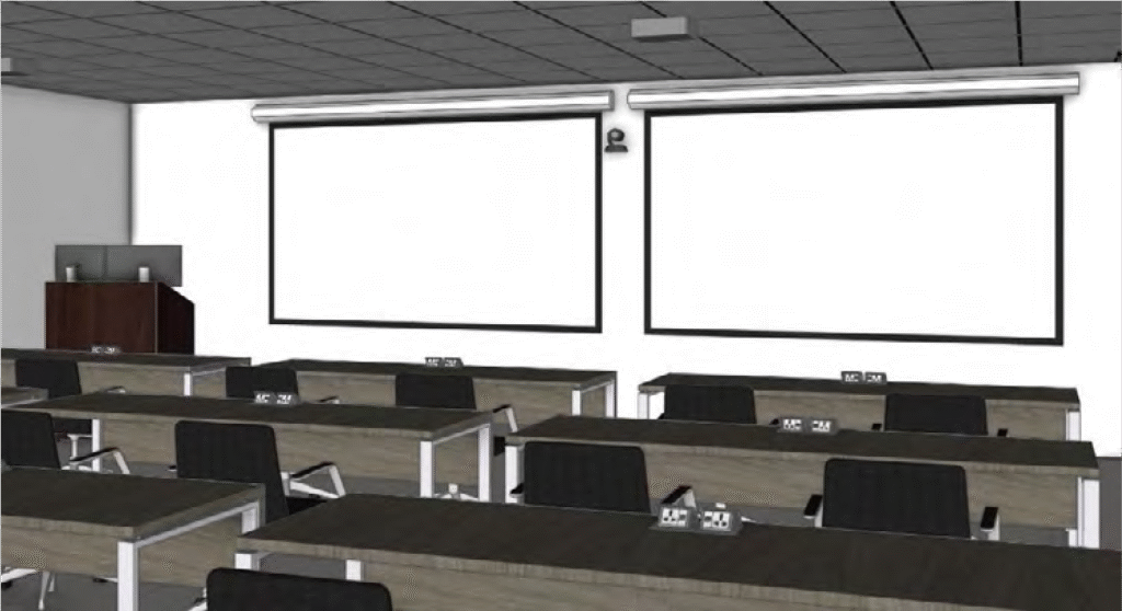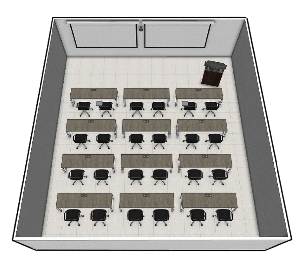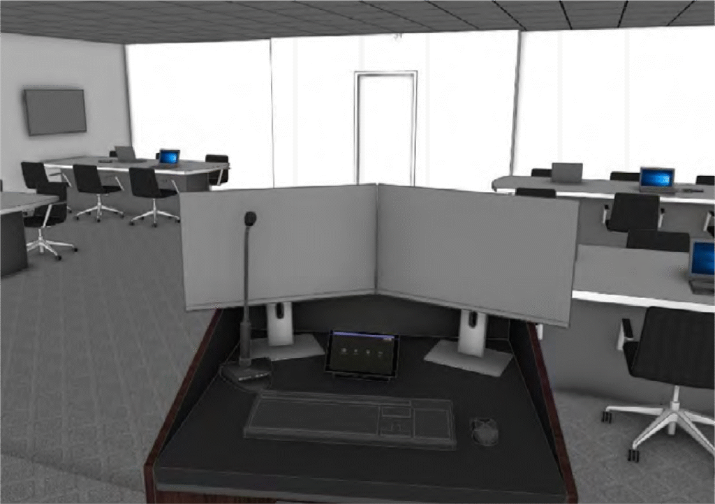 Instructor led collaborative classroom for up to 25 students. Design intended for reconfigurable student PODs.