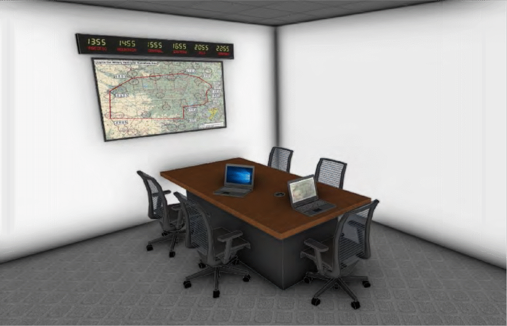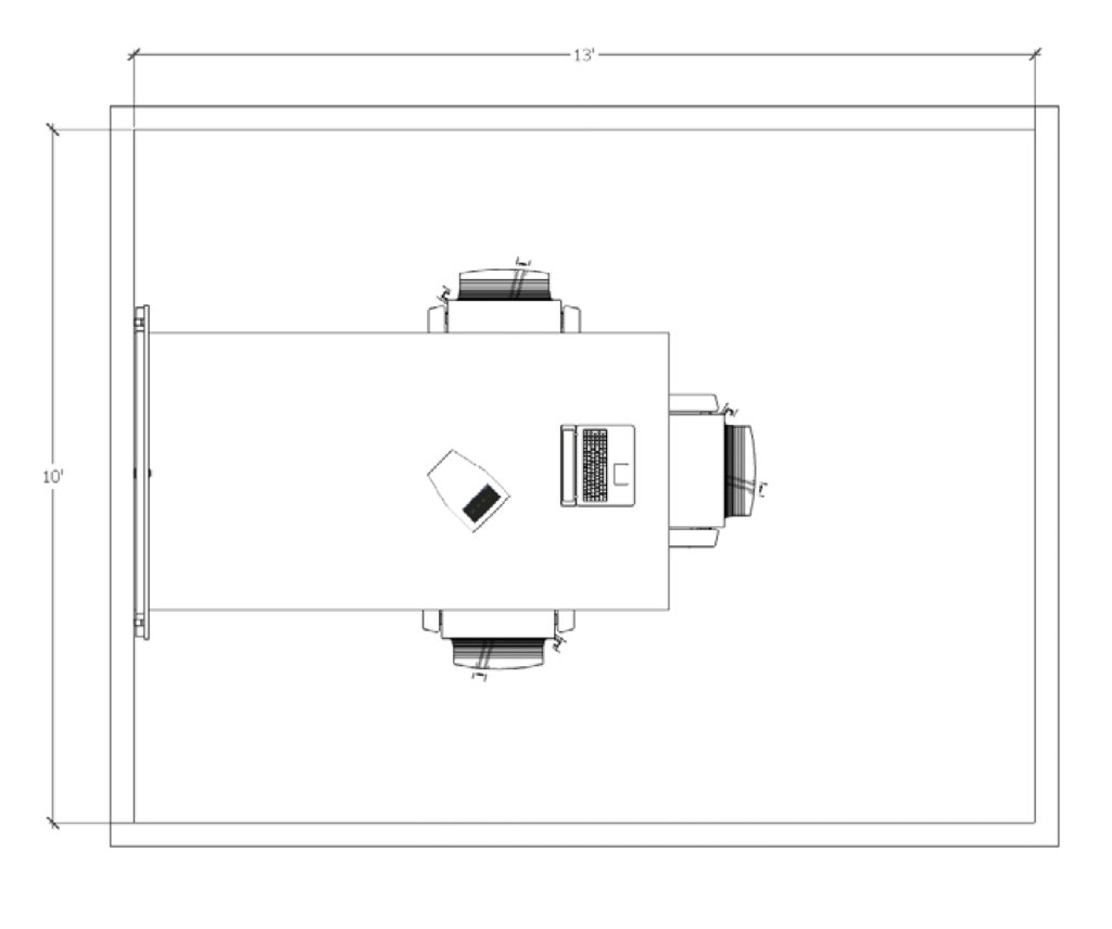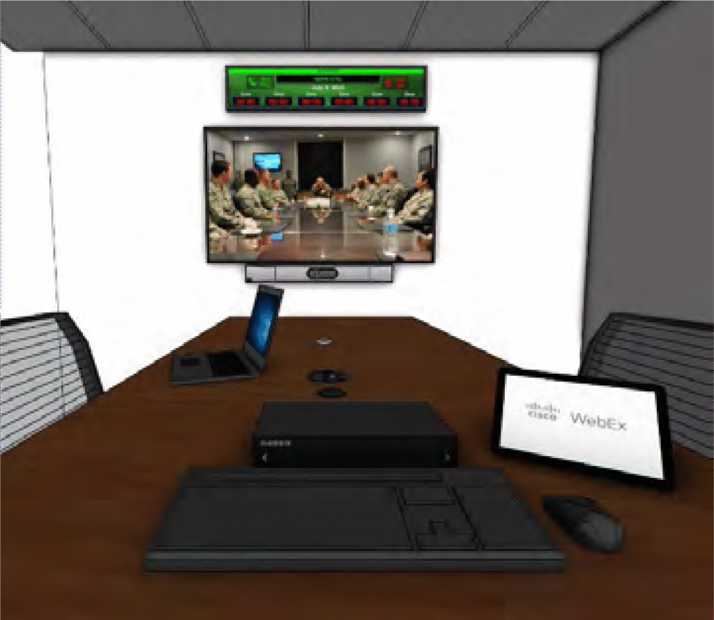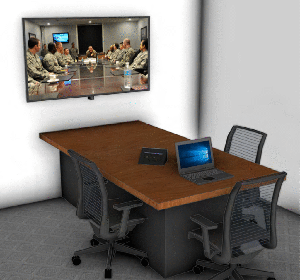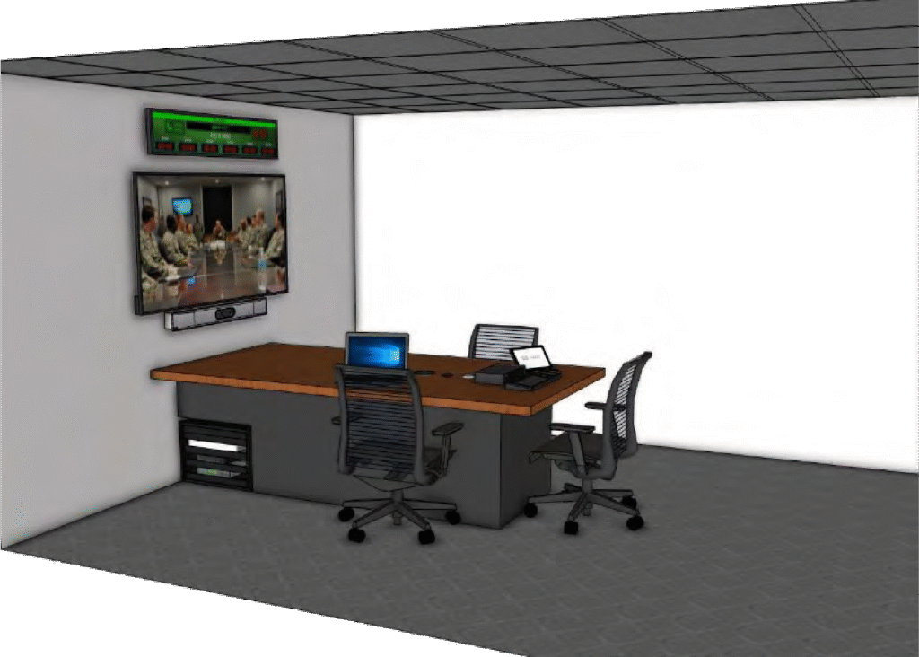 Enhanced AV huddle room with Classified VTC or unclassified WebVTC capabilities and up to 3 PCs.